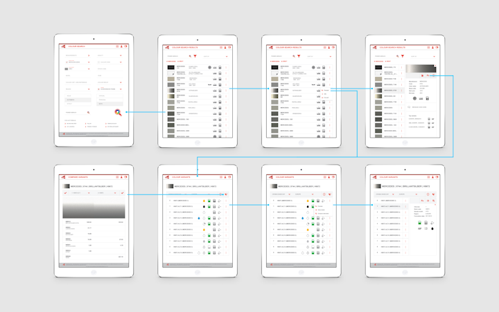 Color Search handles the pre-mixing part of the paint shop process, where the user can find a color using multiple parameters, retrieve variants of that color, and compare variants to choose the best one.