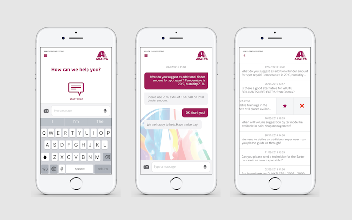 Axalta's customer care chat cross-platform application, where the users can talk to the support teams in real time. Unlike the data-based color tools, the support chat could feature their exciting branding more heavily.