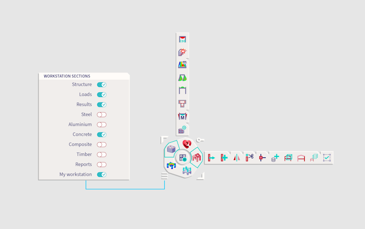 The Workstations are part of the Process Toolbar, a component that contains the most frequently used tools, organised according to a number of processes (Workstations) we identified through user research. The user can easily switch between Workstations, pull up 2 at a time, and even select which Workstations they need to enable in the project.